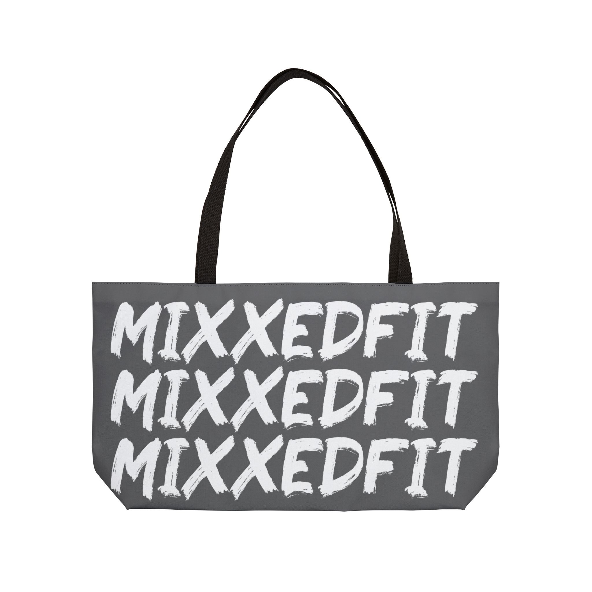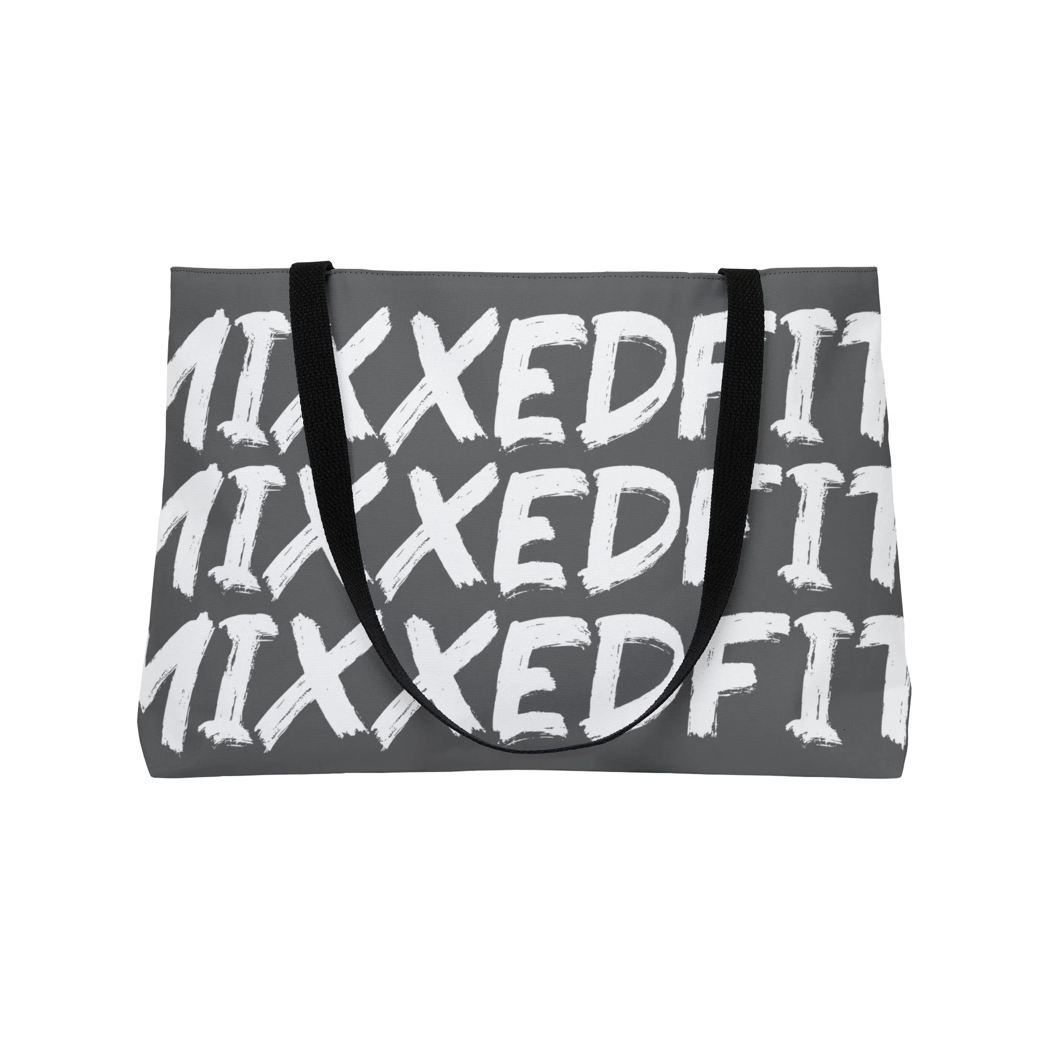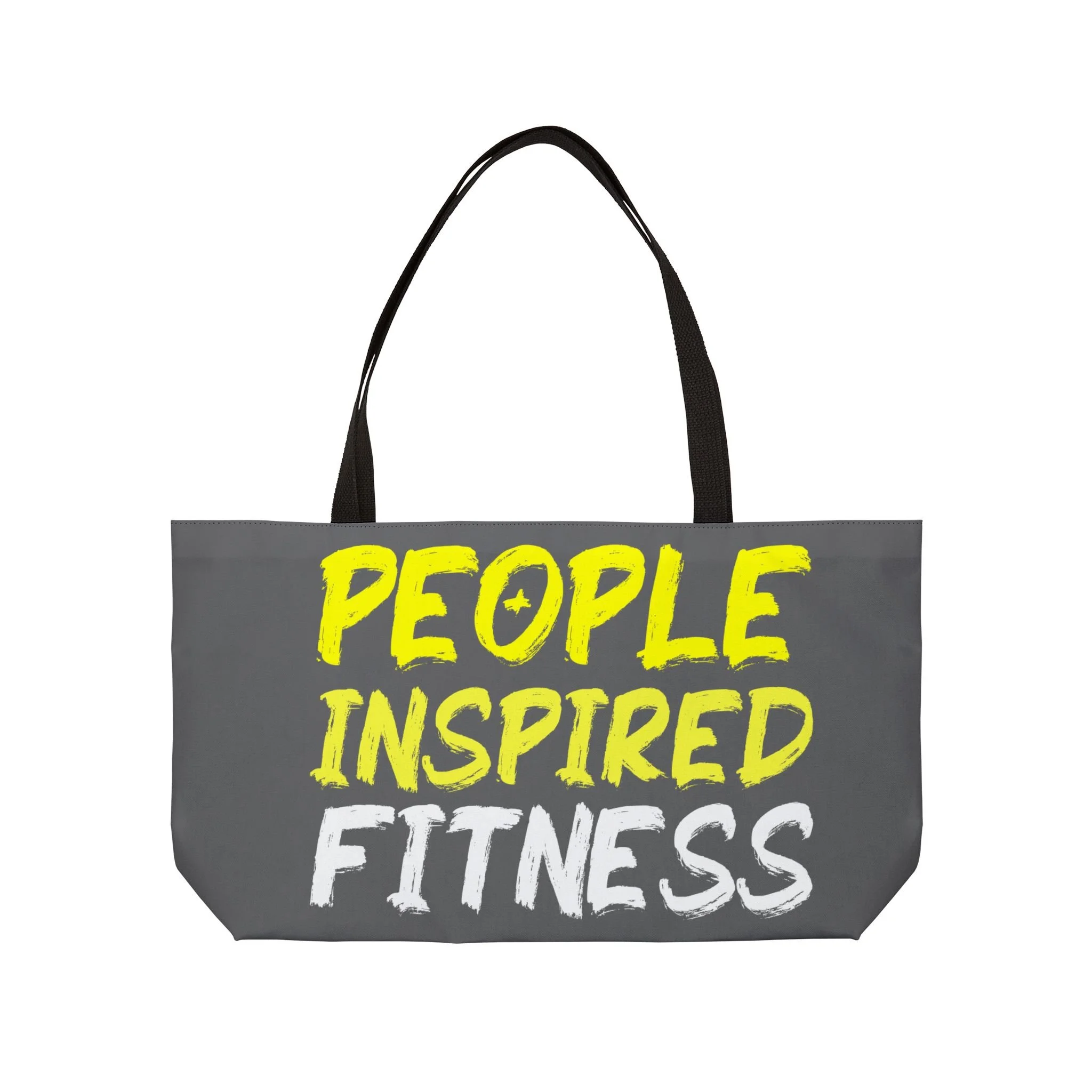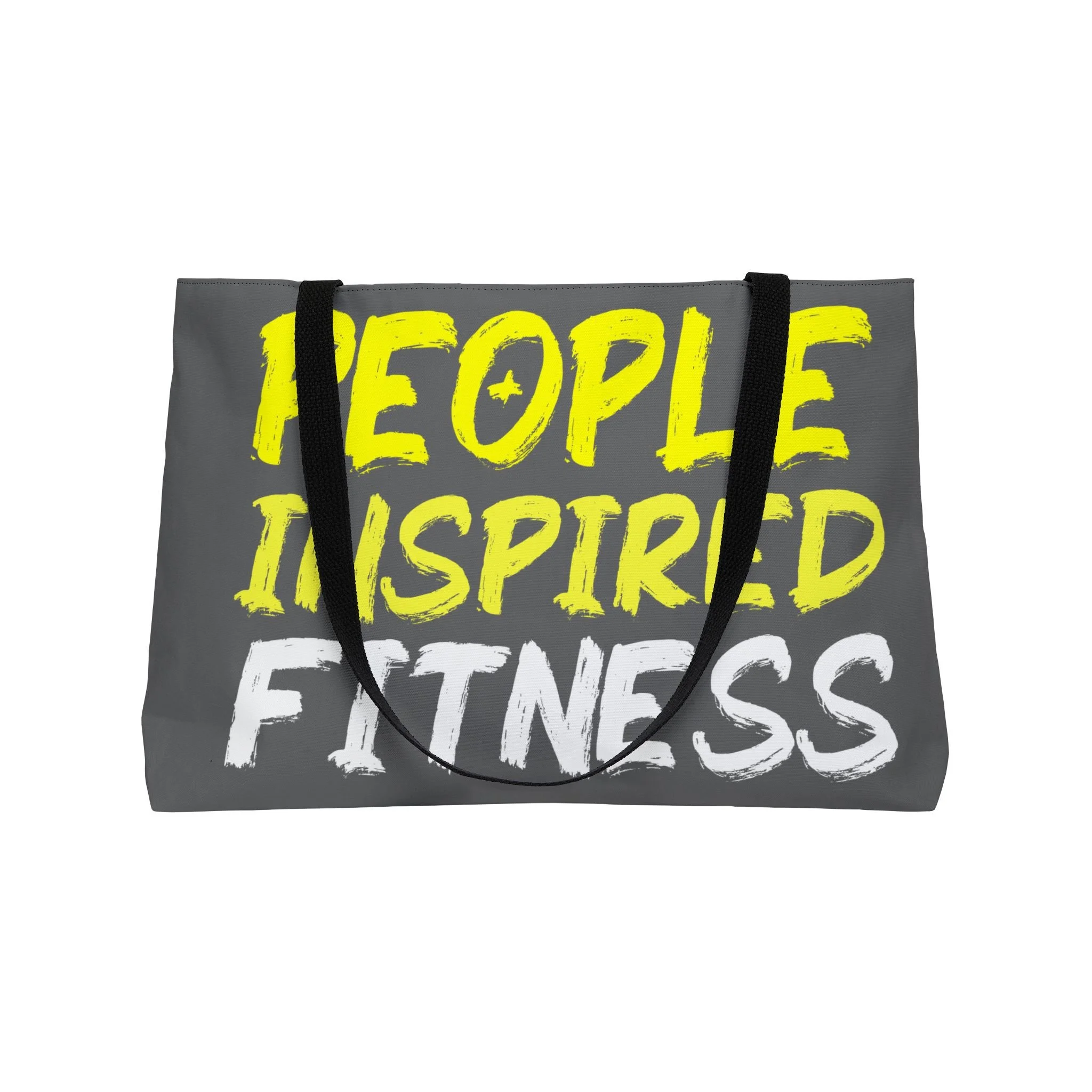 This personalized weekender bag comes in one size – 24" x 13" (60.9 cm x 33 cm) – perfect for those who love to travel light. Its t-bottom construction and black handles give it a sleek, classic look.